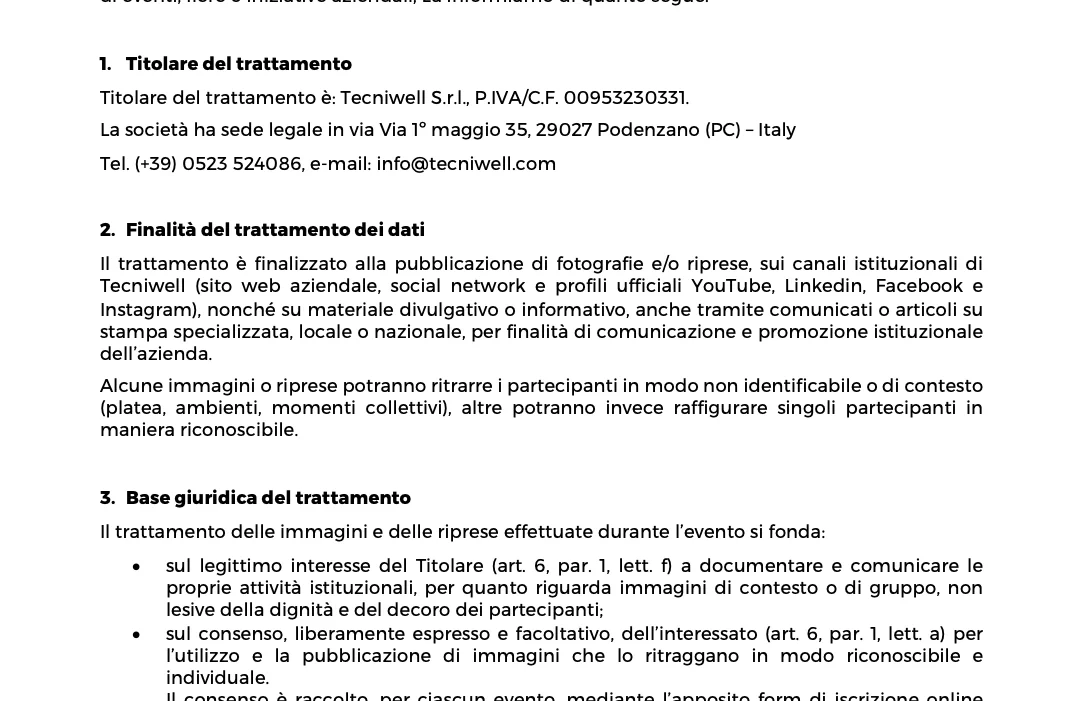 Regolamento Generale sulla Protezione dei Dati Personali (GDPR) per la pubblicazione di immagini e riprese sui canali istituzionali Tecniwell.